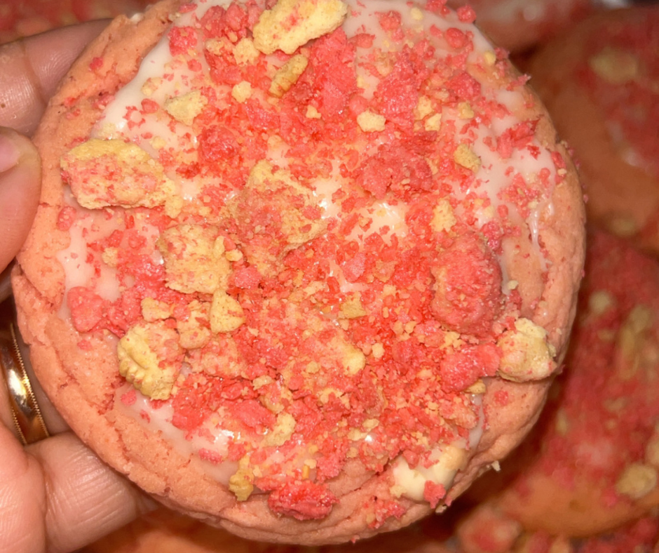 Sweet, Soft and Utterly irresistible. A strawberry cake cookie kissed with creamy, dreamy cream cheese icing and topped with wafers.